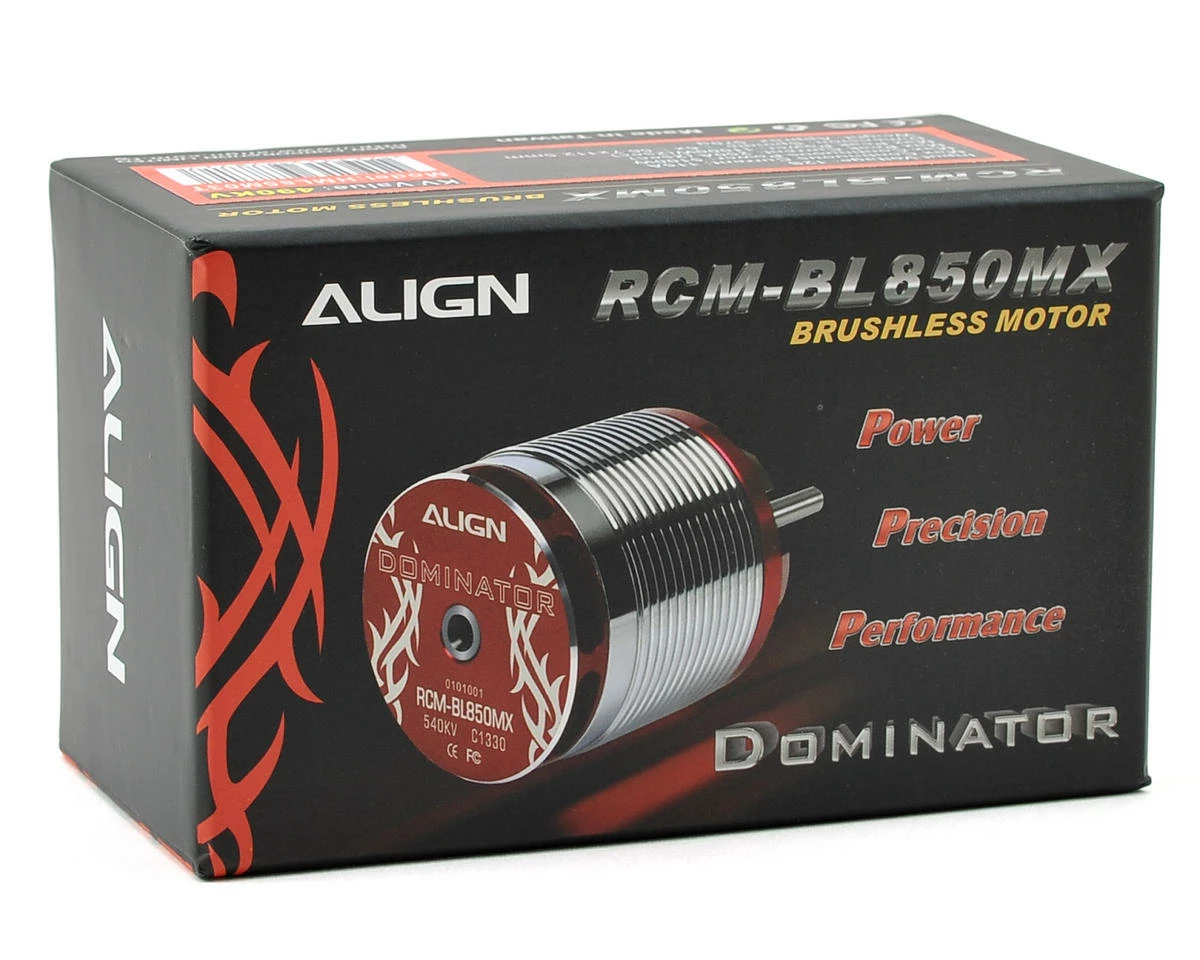 This is the Align 850MX Dominator 490kV Brushless Motor. The Align 850MX was developed by Aligns R&D lab to meet the power and torque requirements of demanding 3D pilots. This motor is a great choice for 700 and 800 class helicopters, delivering 5,100 watts of continuous power output with an incredible 11,000 watts of burst power! The 850MX motor is a high efficiency, low current draw motor that will provide consistent torque and head speed during demanding 3D maneuvers.