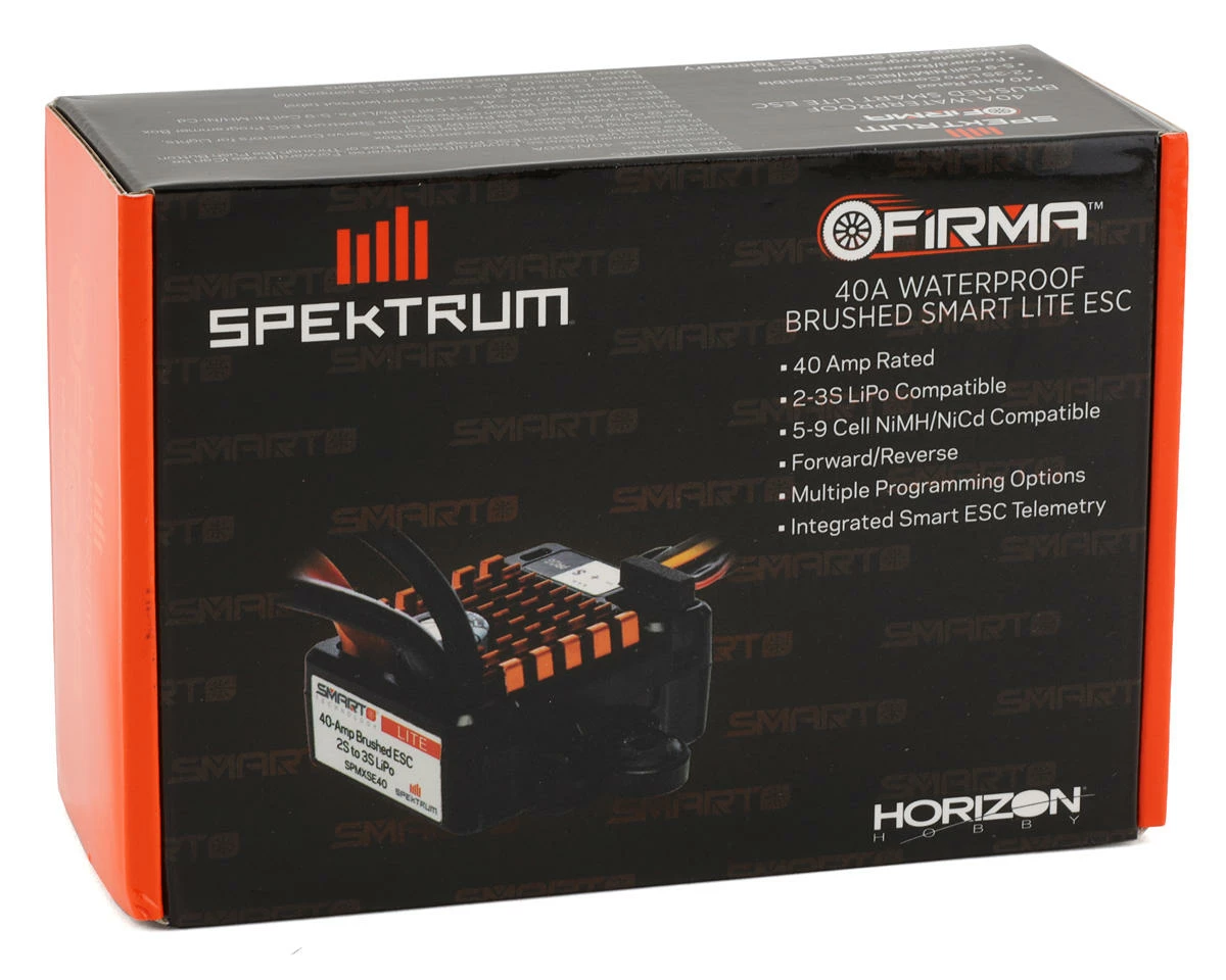Spektrum RC Firma 40A Lite Smart Waterproof Brushed ESC. This waterproof and ready to use ESC is an excellent option for most 1/10th scale RC models. Featuring programming options that make it easy to tune for your on-road and off-road racers, scalers, crawlers, and bashers. This Firma Smart ESC is packed with features such as Spektrum RC’s SMART technology. SMART provides a one-wire solution for obtaining telemetry data such as temperature, battery voltage and capacity. Additionally the Firma 40A Lite offers a plethora of programmable tuning options giving you the utmost control over any application.Â